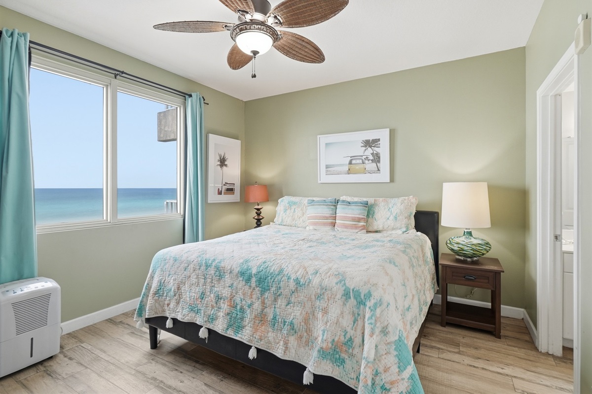 The Master Bedroom has a king bed with plenty of storage space and a beautiful view of the gulf. This room is its own retreat, with a beautiful en suite bathroom that has a shower/ tub combo and a large double vanity. The Guest bedroom also has a king bed, its own full en-suite bathroom, and plenty of space. The Bunk Room has a door for privacy, win/twin bunkbeds, a tv for the kids to watch and a half bath just steps away.